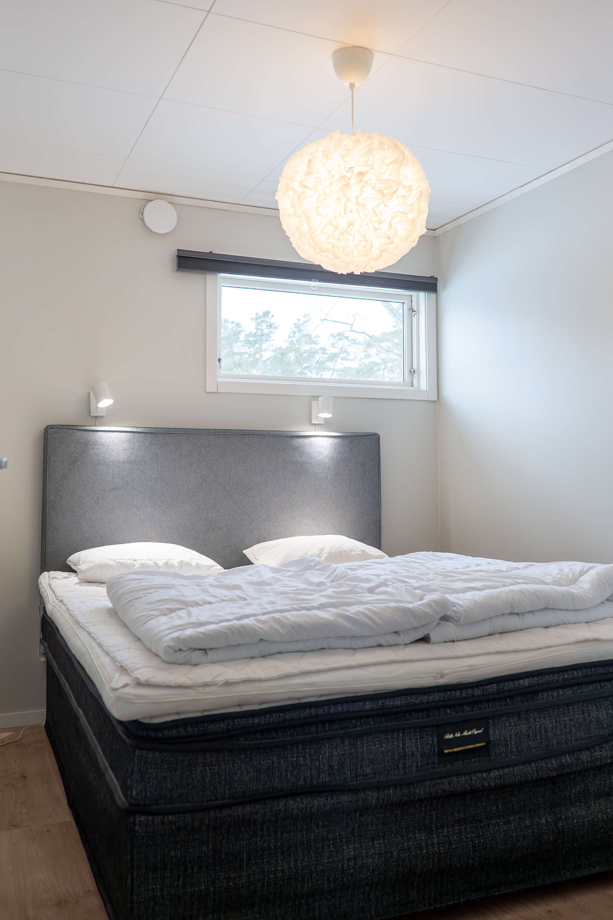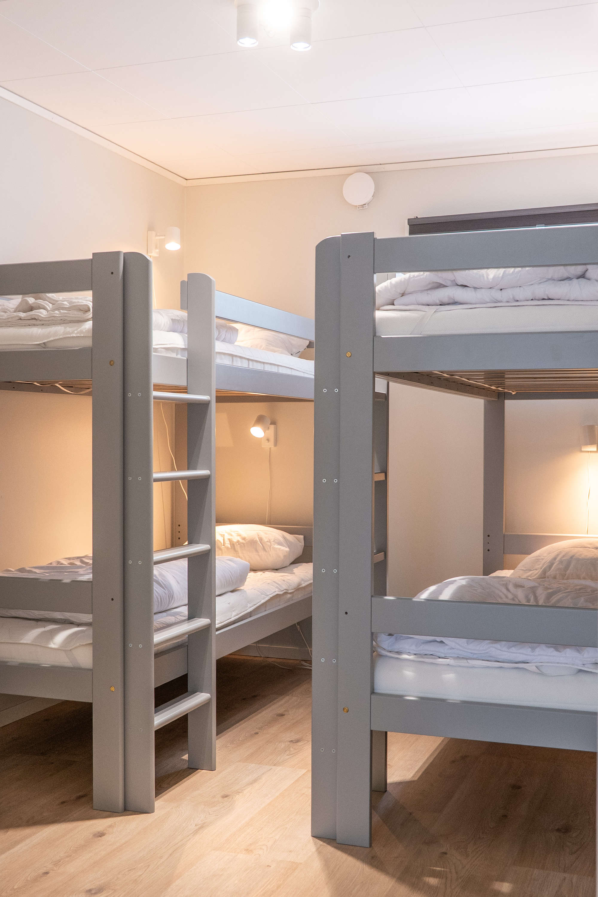 Våra tre radhuslägenheter ligger i samma byggnad och har alla en fantastisk utsikt mot vattnet. Varje radhuslägenhet är 45 kvm stor och rymmer 6 personer. Boendet har två sovrum, det ena har två enkelsängar och det andra två våningssängar. I allrummet finns en soffa med TV samt ett matbord för hela sällskapet. I badrummet finns WC och dusch.